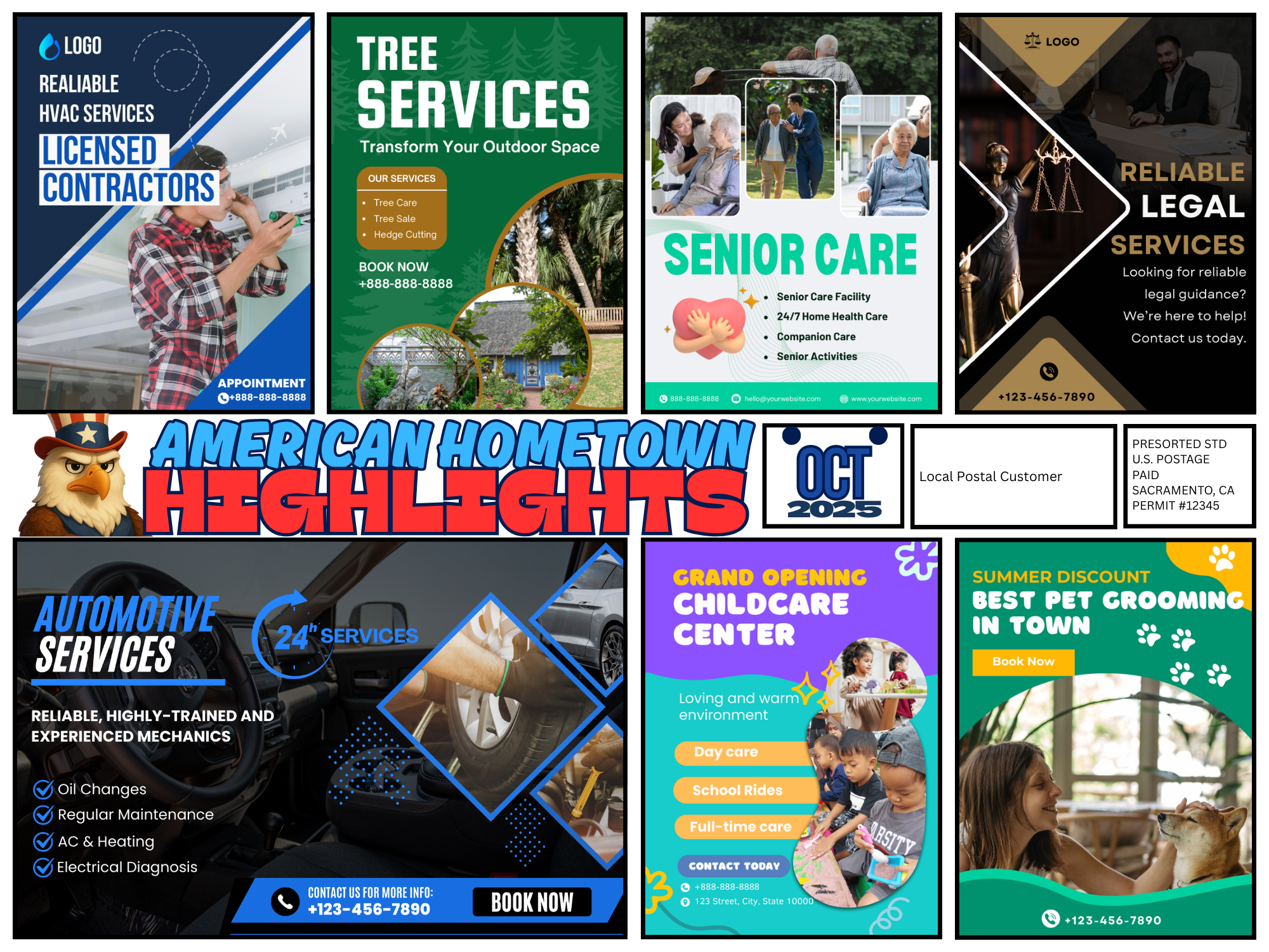 You have made a good decision to place your business on a bold, eye-catching 9″×12″ postcard delivered directly to EVERY doorstep in your local community. Now it’s possible with American Hometown Highlights, the co-op direct mail program that helps you GET SEEN by thousands of neighbors affordably.